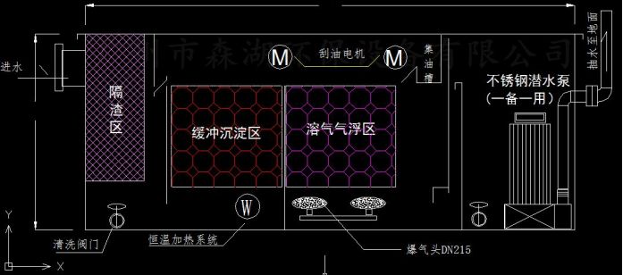 3. 污水流入油水分離腔,通過加熱使油污變得更有流動(dòng)性,通過刮油裝置把油刮除到排油槽,廢油從溢流堰自然流出由廢油收集桶收集起來,定期清理廢油即可,這樣浮油得到去除。